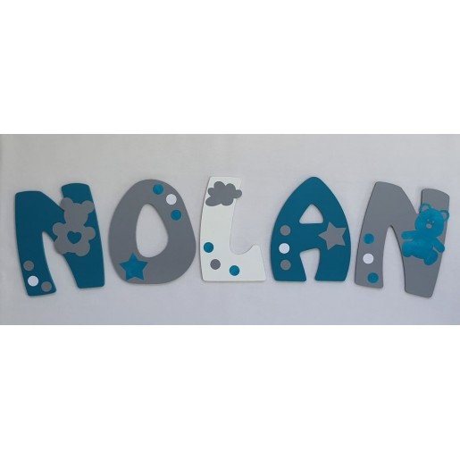 Prénom personnalisé à accrocher au mur, thème "Ourson" couleurs Turquoise, Gris clair et Blanc.