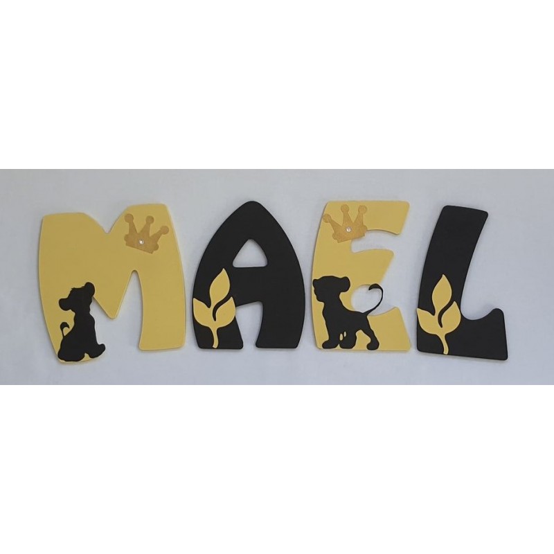 Prénom personnalisé à accrocher au mur, thème "Lion" couleurs Jaune de Naples et Noir.