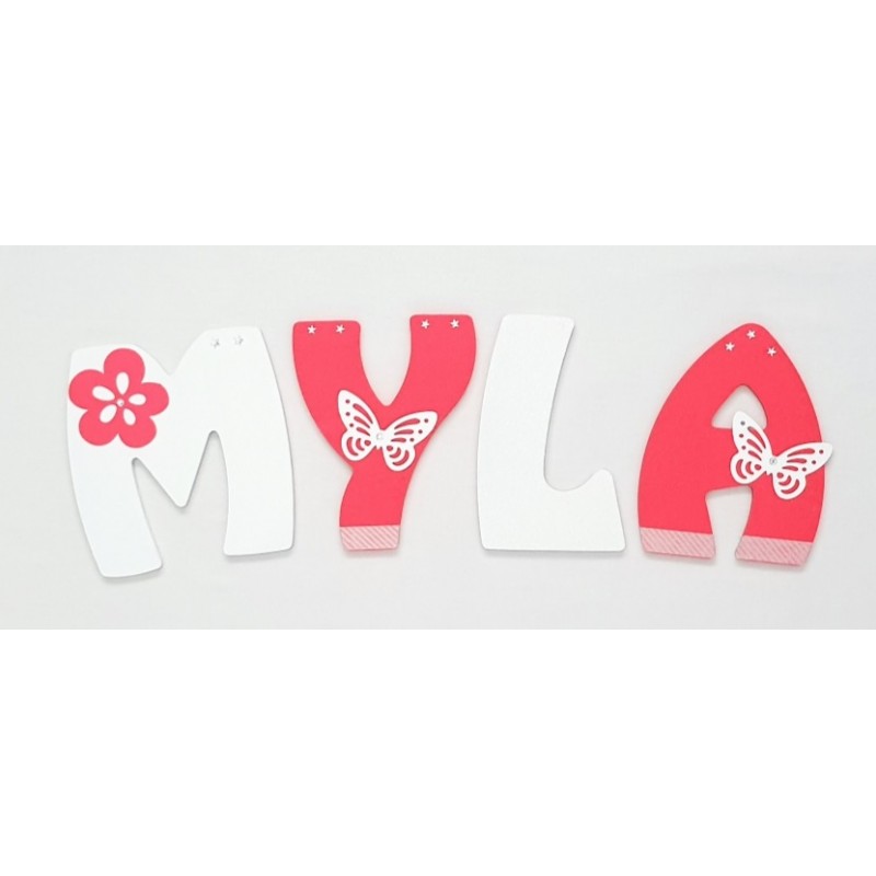 Prénom personnalisé à accrocher au mur, thème "Papillon" couleurs Blanc et Rose Fluorescent.