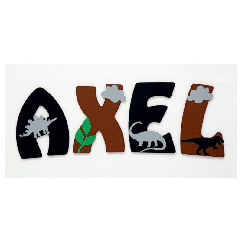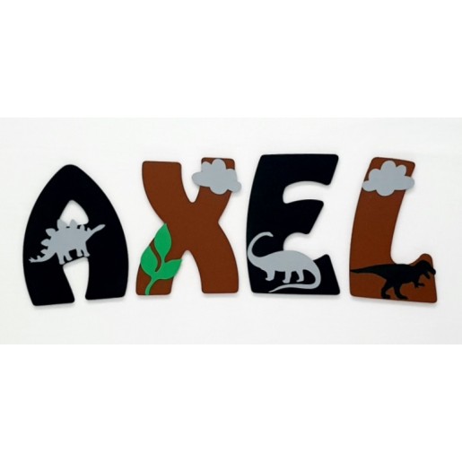 Prénom personnalisé à accrocher au mur, thème "Dinosaure" couleurs Marron de Sienne et Vert Emeraude.