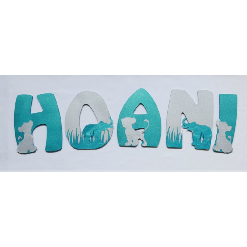 Prénom personnalisé à accrocher au mur, thème "Savane" couleurs Bleu Vert Iridescent et Argenté Iridescent.
