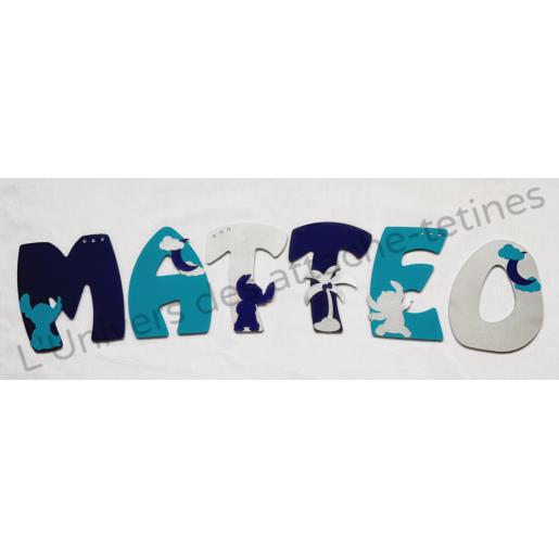 Prénom personnalisé à accrocher au mur, thème "Monstre" couleurs Blanc Titane, Bleu Outremer et Bleu Turquoise.