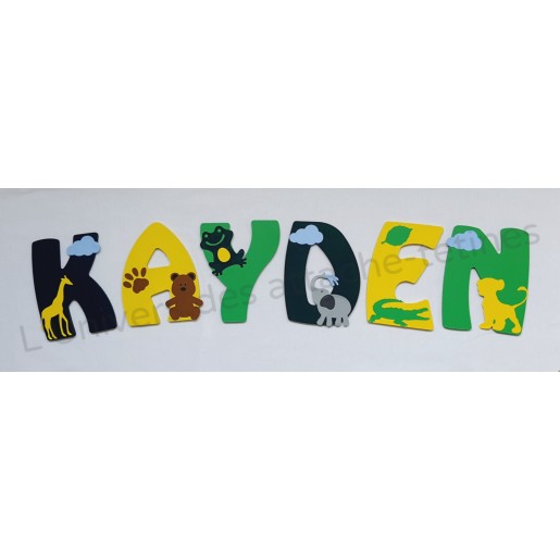 Prénom personnalisé à accrocher au mur, thème "Jungle" couleurs Vert Cadmium, Jaune Primaire et Vert Emeraude.