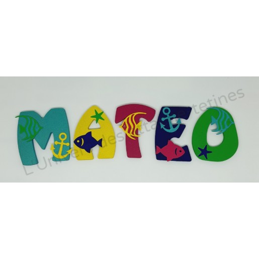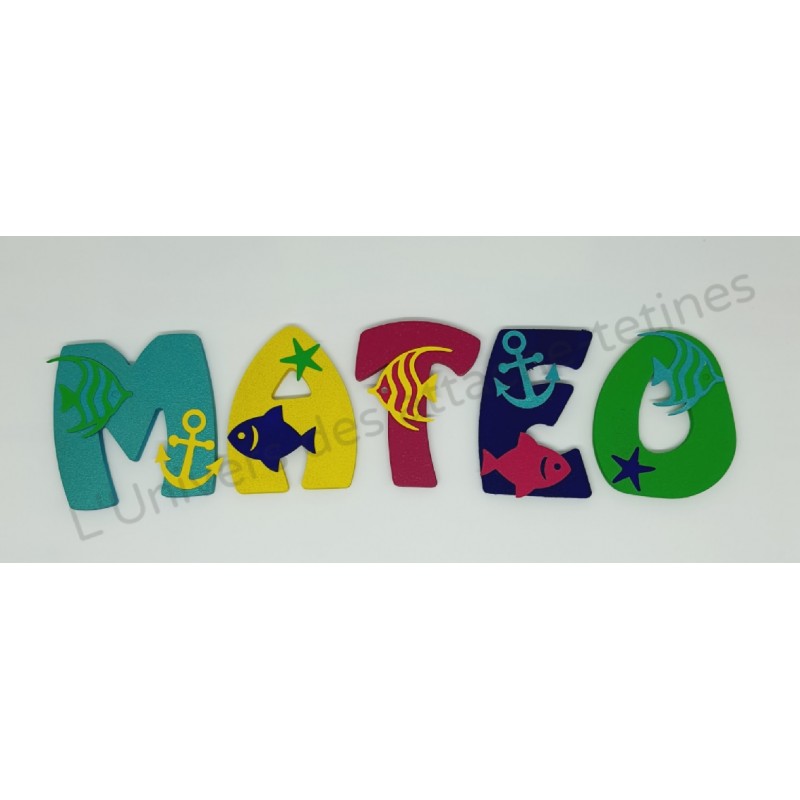 Prénom personnalisé à accrocher au mur, thème "Océan" couleurs Vert Cadmium, Jaune Primaire, Rose Azo, Bleu Outremer et Bleu Vert Iridescent.