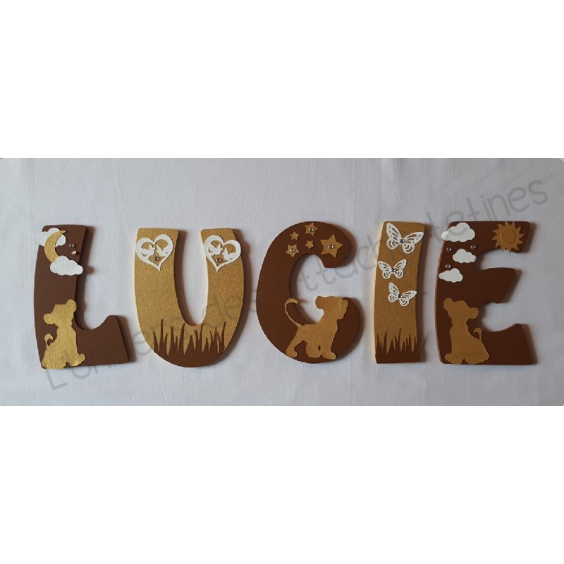 Prénom personnalisé à accrocher au mur, thème "Lion" couleurs Marron de Sienne et Or Iridescent.
